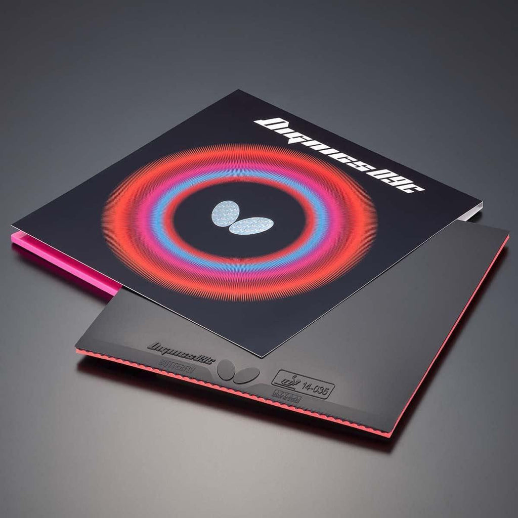 Compatible friction and a high level bounce is realised thanks to the synergy effect between the original top sheet and a rather hard Spring Sponge X, to bring out the features of a friction rubber while upgrading the High Tension effect. The pimples code No. 209 delivers topspin and defensive play with high amount of spin as well as ease of over-the-table techniques and counter topspin. Dignics 09C, with the upgraded friction High Tension features, guides a player who expects the unique feeling of a friction rubber to new heights.